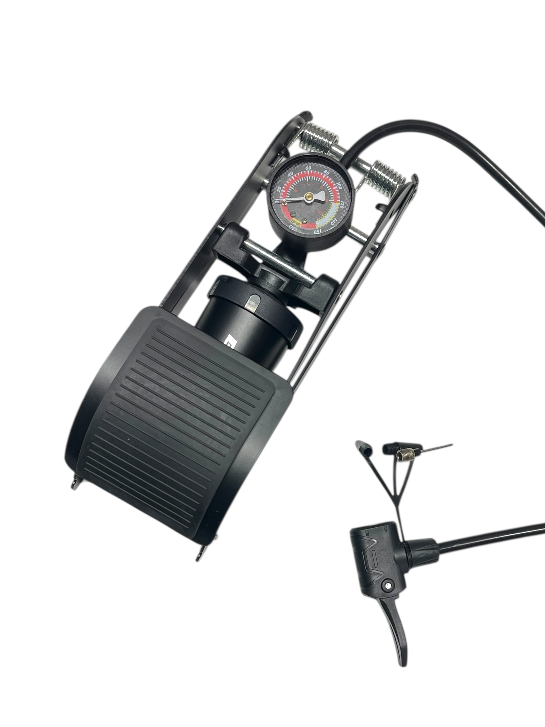 - Pompa de picior cu cilindru realizata din metal si manometru . Contine diverse accesorii cu ajutorul carora se pot umfla anvelopele auto. de motociclete. biciclete. mingi. saltele pneumatice. barci pneumatice