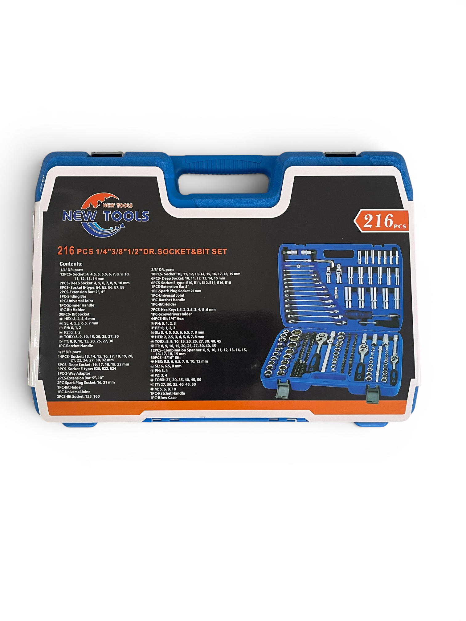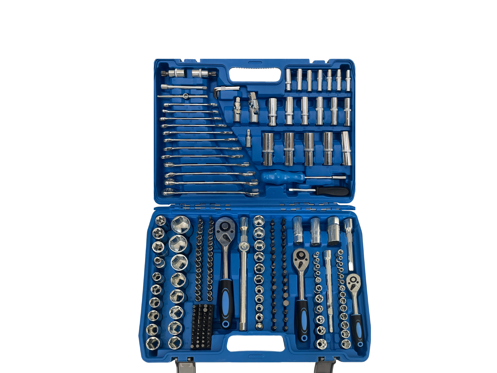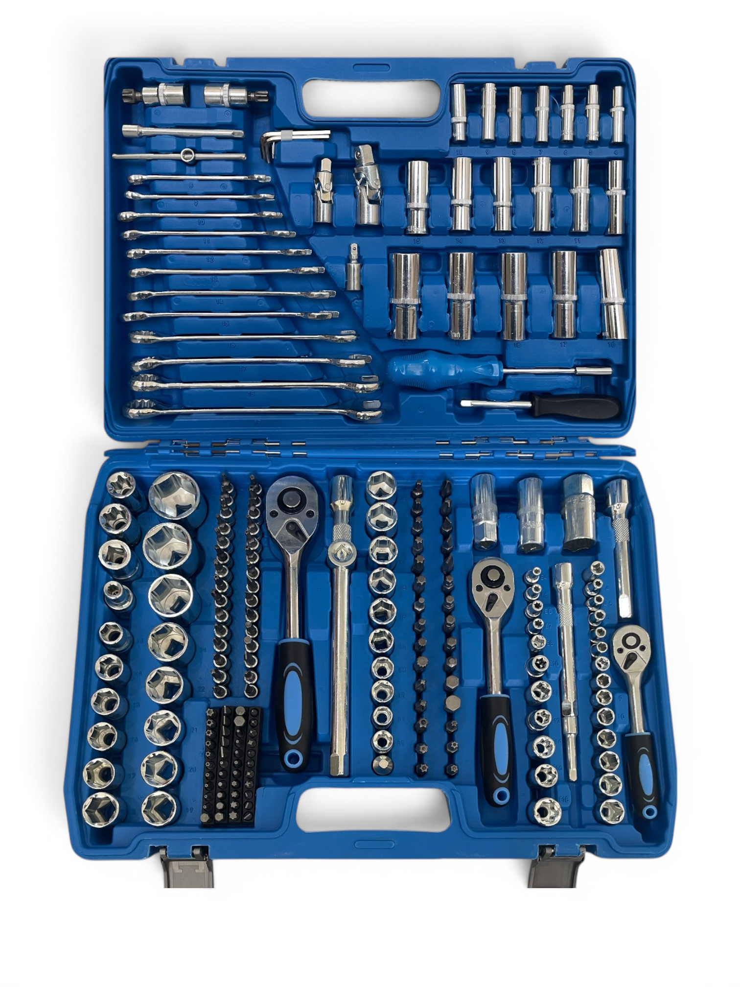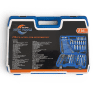Setul include: 1/2″ 1 x Clichet 15 x Tubulare: 10/11/12/13/14/15/17/19/20/21/22/24/27/30/32 mm 5 x Tubulare adanca: 16/17/18/19/22 mm 3 x Tubulare stea: E20/E22/E24 2 x Tubulare bujie: 16/21 mm 2 x Tubulare bit Torx: T55/T60 1 x Adaptor bit 2 x Prelungitor: 127/254 mm 1 x Adaptor cu trei cai 1 x Articulatie universala 1/4″ 1 x Clichet 13 x Tubulare: 4/4,5/5/5,5/6/7/8/9/10/11/12/13/14 mm 7 x Tubulare adanca: 4/5/6/7/8/9/10 mm 5 x Cheie tubulara tip stea: E4/E5/E6/E7/E8 4 x Cheie tubulara canelura: M5/M6/M8/M10 5 x Cheie tubulara hexagonala pentru bit: 5,5/6/6,5/7/8 mm 7 x Cheie tubulara Torx pentru bit: T25/T27/T30/T35/2 x T40/T45/T50 8 x Cheie tubulara Torx anti-manipulare: T27/T30/T35/T40/T45/T50 3 x Cheie tubulara cu crestatura pentru bit: 6/6,5/8 mm 4 x Cheie tubulara Phillips pentru bit: PH3/PH4/PZ3/PZ4 1 x Maner rotativ 1 x Maner rotativ cu adaptor pentru bit 1 x Adaptor pentru bit de actionare 2 x Bara de extensie: 50,8/101,6 mm 1 x Bara de extensie flexibila: 150 mm 1 x Bara T glisanta 1 x Articulatie universala 3/8″ 1 x Clichet 10 x Cheie tubulara: 10/11/12/13/14/15/16/17/18/19 mm 6 x Cheie tubulara adanca: 10/11/12/13/14/15 mm 6 x Cheie tubulara stea: E10/E11/E12/E14/E16/E18 1 x Adaptor bit 1 x Cheie tubulara bujie: 18 mm 1 x Prelungitor: 125 mm 1 x Articulatie universala 7 x Cheie hexagonala: 1,27/1,5/2/2,5/3/4/5 mm 12 x Cheie combinata: 8/10/11/12/13/14/15/16/17/18/19 mm BITURI Biti – 5 x Cheie hexagonala de 5/16″: 5,5/6/6,5/7/8 mm 7 x 5/16″ Bit Torx: T25/T27/T30/T35/2 x T40/T45/T50 Bit Torx anti-manipulare 6 x 5/16″: T27/T30/T35/T40/T45/T50 Bit cu crestatura 3 x 5/16″: 6/6,5/8 mm Bit Phillips 4 x 5/16″: PH3/PH4/PZ3/PZ4 Bit canelura 4 x 5/16″: M5/M6/M8/M10 Bit Phillips 4 x 1/4″: PH1/PH2/PZ1/PZ2 Bit Torx 5 x 1/4″: T8/T10/T15/T20/T25 Bit Torx anti-manipulare 6 x 1/4″: T8/2 x T10/2 x T15/2 x T20/2 x T25/T40 4 biti hexagonali de 1/4″: 3/4/5/6 mm 5 biti hexagonali anti-manipulare de 1/4″: 3/4/5/6 mm 3 biti caneluri de 1/4″: M5/M6/M8 2 biti patrati de 1/4″: S1/S2 2 biti cu trei aripi de 1/4″: 1/2/3 mm 3 biti cu patru aripi de 1/4″: 6/8/10 mm 3 biti pentru cheie fixa de 1/4″: 4/6/8 mm